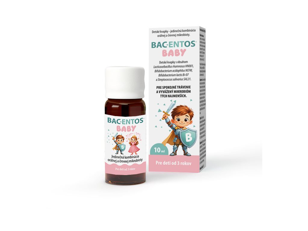 BAC-ENTOS BABY je výživový doplnok vo forme kvapiek určený pre deti od 3 rokov. Obsahuje starostlivo vybranú kombináciu štyroch probiotických kultúr, ktoré podporujú prirodzenú obranyschopnosť, zdravé trávenie a rovnováhu mikrobioty v črevách aj v ústnej dutine.